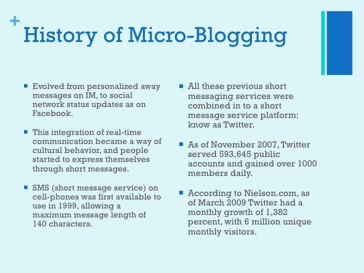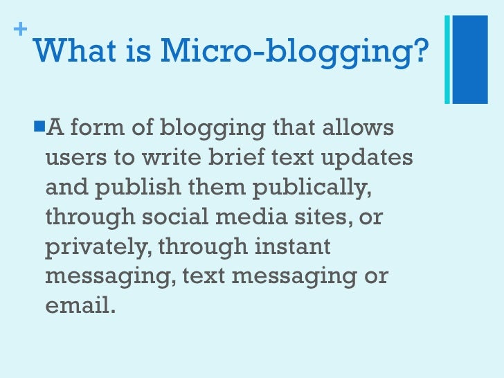 Micro blogging description. Explore more on Micro-blogging Website. Blogging with its more formal standards and requirements doesnt allow that. Microposts can be made public on a Web site andor distributed to a private group of subscribers.